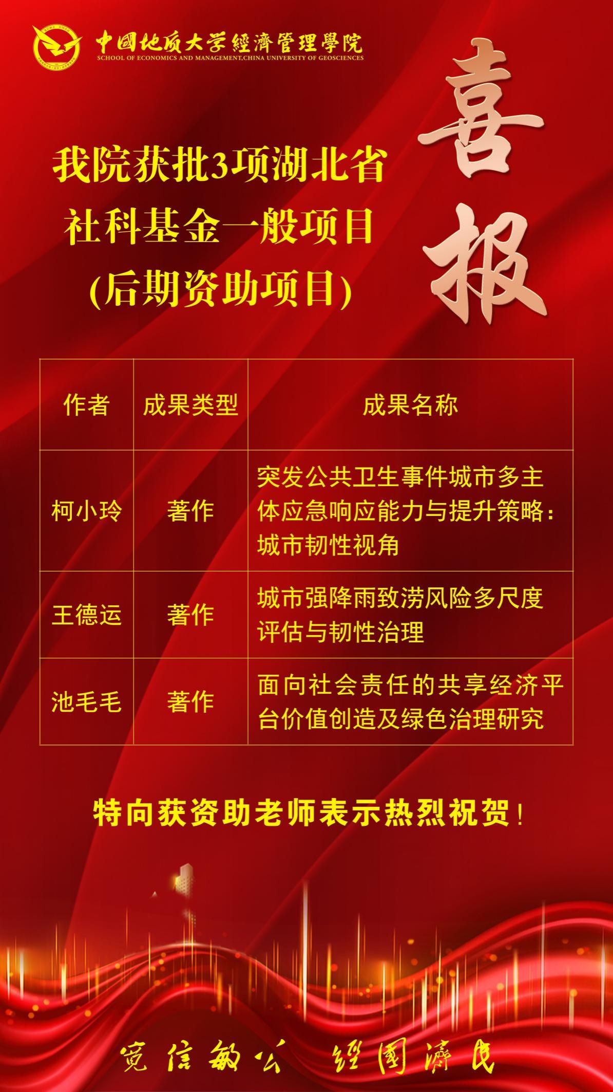 (通讯员 胡松琴)11月14日,2023年度湖北省社科基金一般项目(后期资助项目)拟立项名单公布,bevictor伟德国际柯小玲、王德运、池毛毛三位老师申报的课题项目成功立项,公司科研成果再次喜获丰收。