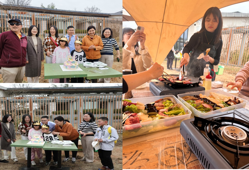 午饭时分,特意为三月份过生日的教职工们准备了香甜的生日蛋糕。唱响那首熟悉的生日快乐歌,许下美好的生日愿望,接下来是半自助式烧烤午餐。烧烤中,大家各显身手,各展厨艺,共同在烤盘上烹饪出滋滋美味,美食的香味同欢声笑语交织中,喝一碗鲜美的鸡汤,佐一杯甘甜的米酒,品尝到的是乡间美食,盛放的是满足的味蕾和欢乐幸福的笑容。