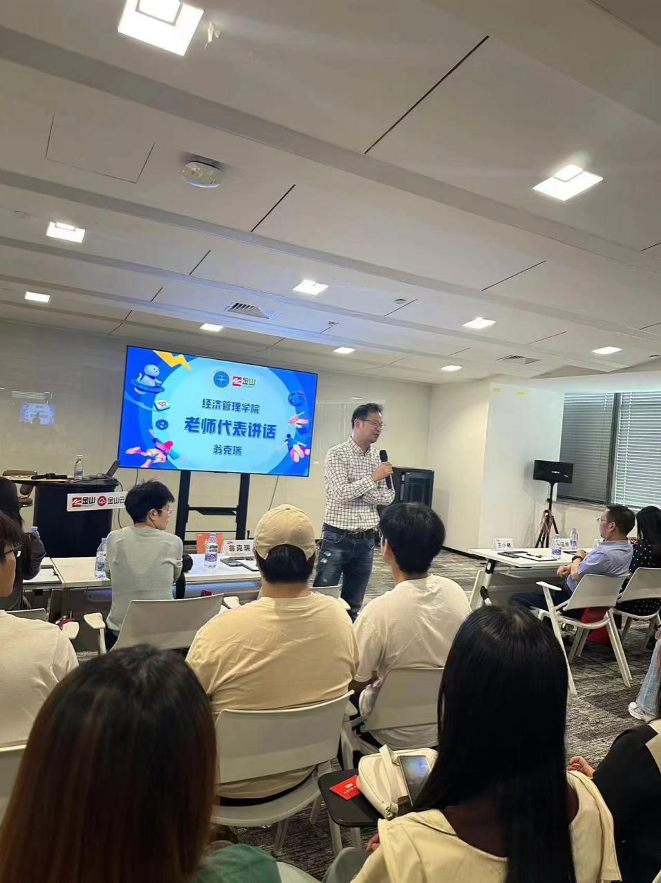 管理科学与工程系副教授翁克瑞老师讲话。他向精心组织本次参访活动的集团员工表示感谢,也鼓励到场员工抓住公司公司提供的宝贵实习机会,在实践中锤炼真本领,为今后走入工作岗位打下坚实基础。