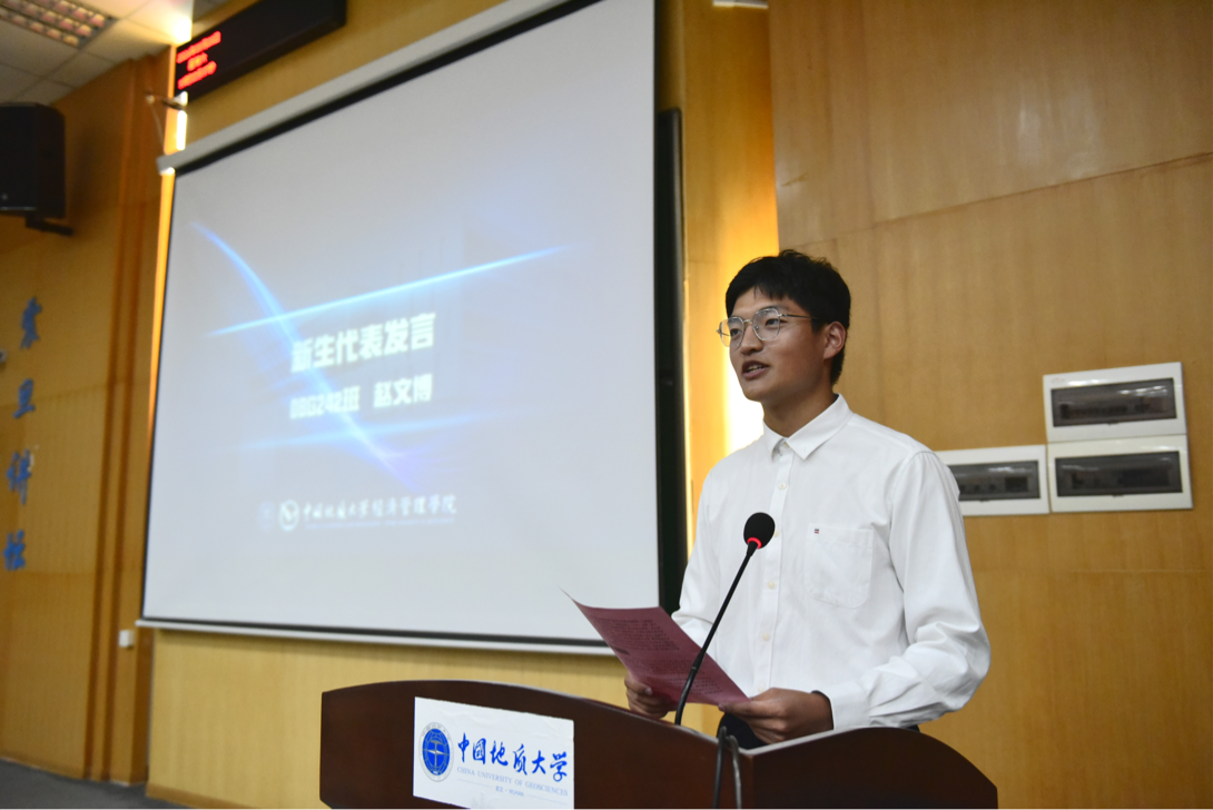 典礼第五项2024级新生代表赵文博同学发言。他以同为地大员工的母亲为榜样。他号召全体新生珍惜宝贵的大学时光,在享受老员工活的同时不忘初心,努力学习,积极参加社会实践,不断磨练个人意志,努力成长为勇担社会责任与历史使命的时代新人。