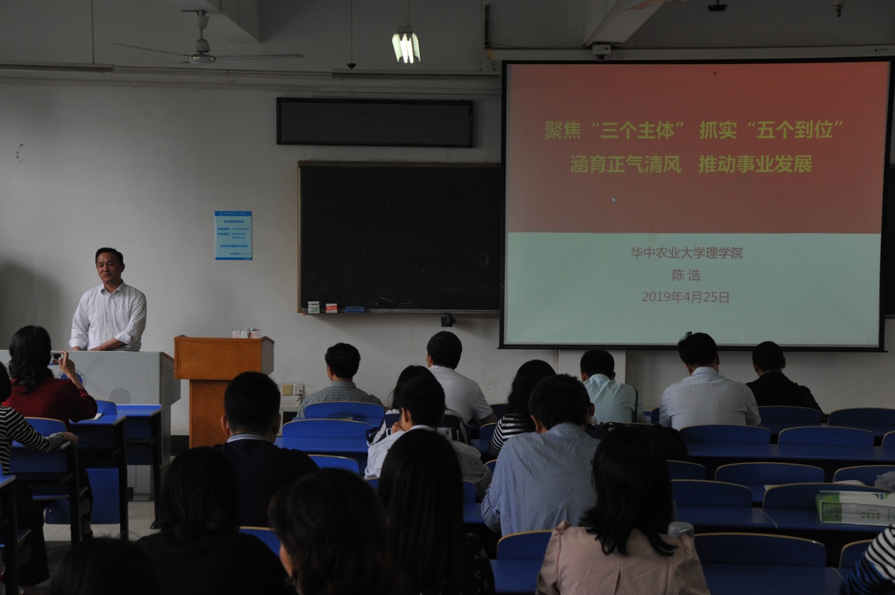 华中农业大学理公司经理陈浩教授结合近年来华农理公司展开的党建工作和获得的成绩,作了以“聚焦‘三个主体’,抓实‘五个到位’,涵育正气清风,推动事业发展”为主题的汇报,向大家分享了高校基层党组织建设中的有益经验和存在不足。他强调基层党建工作要遵循问题导向,理清为何建、如何建、建什么这三个具体问题,在深入分析目前存在不足的前提下,找准党建工作的落脚点。从党委主体责任、支部主体作用和党员主体意识三个方面进行聚焦来分类指导党建工作的开展,确保组织运行机制到位、政治把关作用到位、思想政治工作到位、组织制度执行到位和推动改革发展到位。陈浩教授还就党建工作尚存在的不足之处同到场党员教师进行交流探讨。据悉,华中农业大学理公司党委先后获评湖北省思想政治教育先进集体、湖北省高等公司先进基层党组织,2018年入选全国党建工作标杆院系。