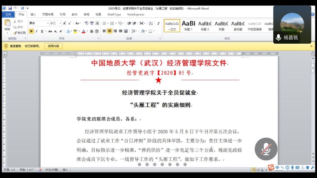 (通讯员:陈艳)2020年5月11日下午14:30,经济学系在线召开了“2020届毕业生毕业就业双促会”。经管公司党委书记杨昌锐、副书记沈波、就业指导老师田昆、经济系全体教师参加了本次会议。会议由经济系支部书记齐睿老师主持。