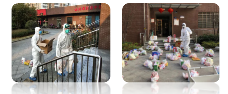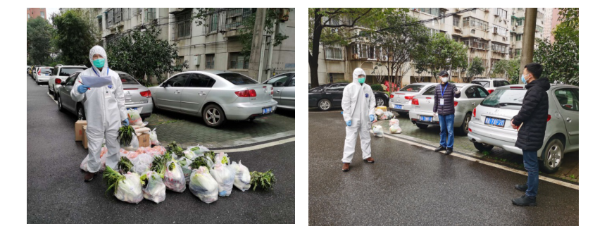 (左:刘耕老师正在分发居民订购物资 右:刘勇胜董事长视察慰问)
