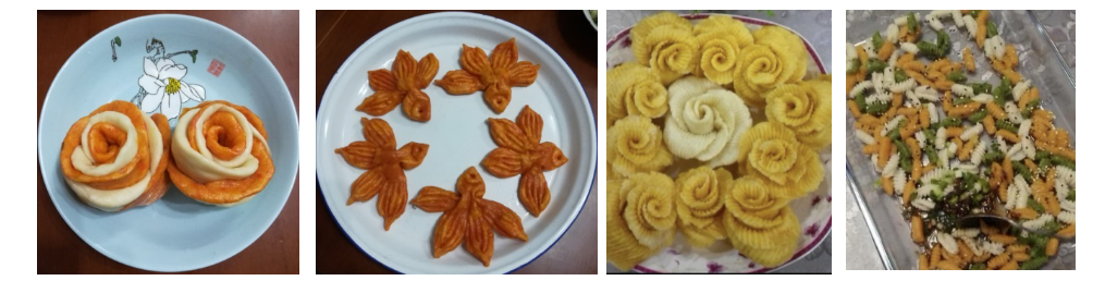 (左一左二:鲜花和小金鱼 作者:倪琳 右一右二:发糕和陕西搓麻食 作者:宋莉萍)