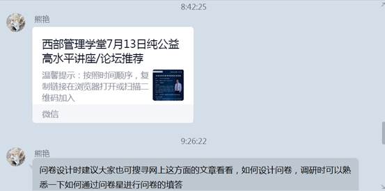 针对同学们反馈出的“期望聆听更多讲座”等要求,在过去的两周实习内,实习指导老师积极为同学们提供学习资源,尤其是顶尖学者汇聚的讲座、会议等,以期待我们能够更好地了解营销领域的研究前沿理论和研究方向。熊艳老师为大家推荐了“西部管理学堂”公众号等具有较多高质量免费讲座等学习资源的公众号,也特别提到了将会参照同学们的意见来安排接下来的讲座学习内容。