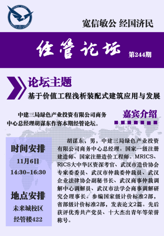 2020年11月6日下午,中建三局绿色产业投资有限公司商务中心胡谋东总经理做客经管论坛,在未来城校区bevictor伟德国际422作了《基于价值工程浅析装配式建筑应用与发展》的报告。王广民、孙涵、翁克瑞、柯小玲、何晨琛、卢辉、彭亚婷等老师及多位博、硕士研究生到场聆听胡谋东总经理的精彩报告。