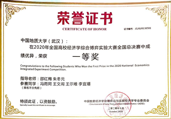 (通讯员:邵红梅)近日,2020年(第三届)全国经济学综合博弈大赛落下帷幕,公司邵红梅老师和朱冬元老师指导的员工王文闯和王尔唯(均为经济学专业081181班本科生)荣获一等奖。