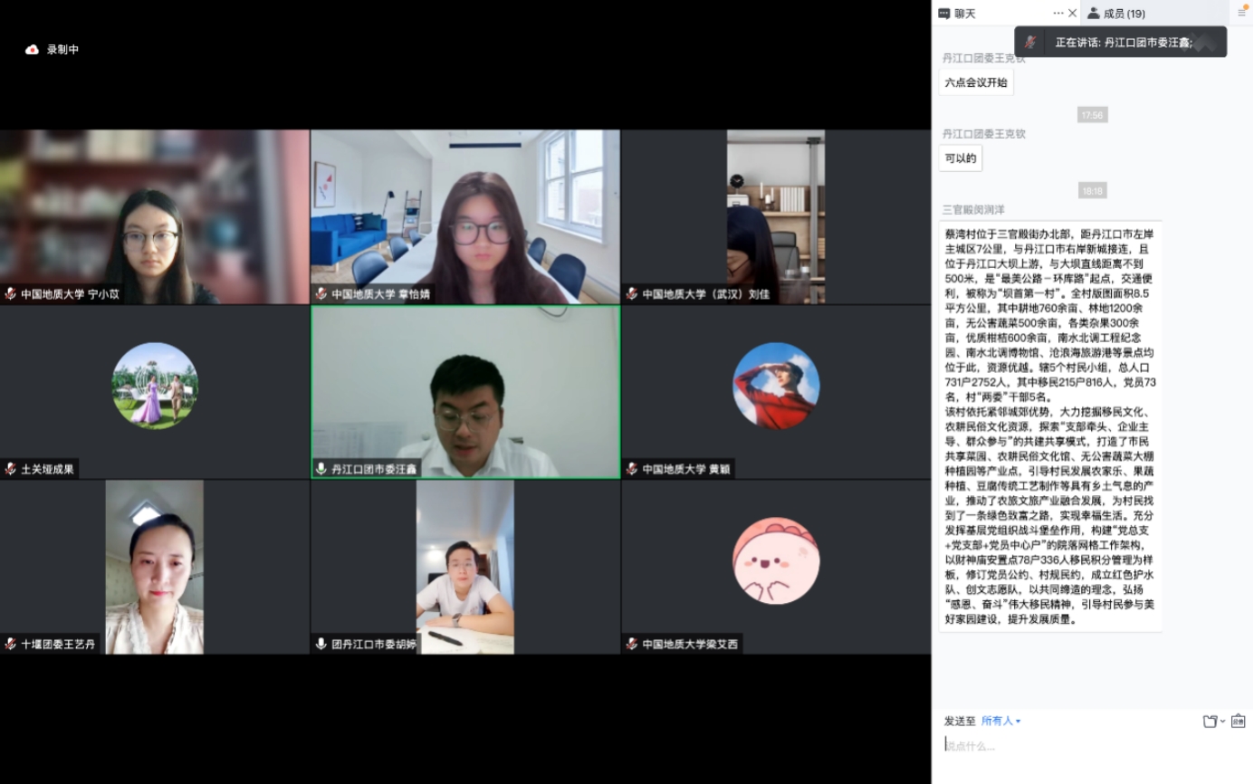 十堰团市委副书记王艺丹讲到,非常有幸与地大结缘,感谢并欢迎青年朋友加入“共同缔造”工作,续写好我们的故事。她指出现有的方案结合了当地特色和地大实践队优势,也很有共青团元素,并提出三点建议。一是进一步深化共同缔造活动的出发点,青力缔造的着力点,找准组织实施的切入点,主动谋划融入、勇于创新;二是要以青少年需求为导向,激发青少年内生动力共同创建共同参与,浓厚青力缔造氛围;三是围绕中心服务大局,让更多可以团结的力量融入进来,把美好生活概念与党的要求保持一致,对接好村和青年实践队伍,能够探索出可复制、可推广、可借鉴的实践经验。