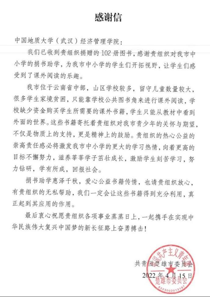 在一年的支教生活中,张康同学始终不忘自己是一名地大经管人,生活中发扬“艰苦朴素,求真务实”的校训精神,牢记“宽信敏公,经国济民”的院训精神,做到把地大精神带到服务地,讲好地大故事。积极配合研支团完成把地大特色活动开展到龙江的任务;利用班会时间给员工们播放地大相关宣传视频,讲述个人求学的故事,播撒希望种子。在五四青年节前夕,他带着支教团同学联系母校,发起向云南省楚雄市山村中小公司捐赠书籍的公益活动。本次捐赠活动得到了母校多个公司的大力支持,共筹集到书籍600余册,其中bevictor伟德国际捐赠图书102册,涵盖文学、科普、经济、教育等多个领域。共青团楚雄市委员会对支教团及地老员工捐赠之举表示衷心的感谢,并向公司发来感谢信。