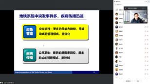 10月28日下午2:00,北京交通大学吴建军教授为公司师生做了题为“城市轨道交通应急运营管理”的学术报告。吴建军教授从理论、具体问题、应用场景及操作系统四个方面全方位、多角度地展示了轨道交通所面临的安全问题及解决措施;接着,又从突发事件的种类、需求管理、调度优化及客流疏散四个方面,由浅入深地讲解了轨道交通中突发事件的应急管理问题。最后,吴建军教授从地铁结伴出行识别、熟人网络病毒传播及大规模地铁网络疫情传播等视角,展示了轨道交通管理领域的一些前沿成果。本次会议共吸引了80余位师生参加,吴建军教授的报告令参会师生深受启发。