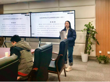 会议第二项,辅导员徐媛老师就公司近期指定的竞赛分级认定办法征集了在会同学意见。徐媛老师介绍到,本次竞赛分级认定办法修改,意在引导广大同学积极参与经济管理学科领域内的各项赛事,落实公司培养专业型人才的要求,提升员工的专业素养。谢诗卉、王铭铭、梁艾西等同学分别从本研不同层次、学科专业特点、备赛过程和成果等角度提出对认定办法的意见、建议。李少杰副书记和徐媛老师予以积极解答,并做好整理记录。