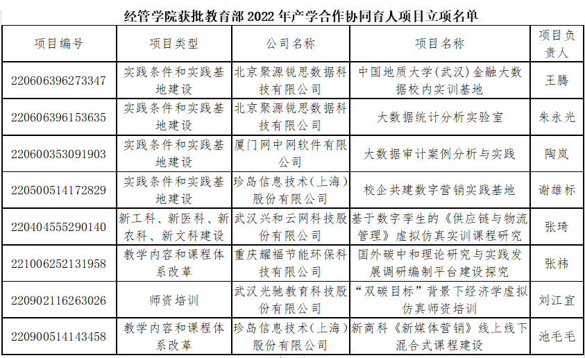 近日,教育部高教司印发了《教育部高等教育司关于公布2022年产学合作协同育人项目立项名单的通知》,公司46个项目获批立项,其中经管公司获批8项。