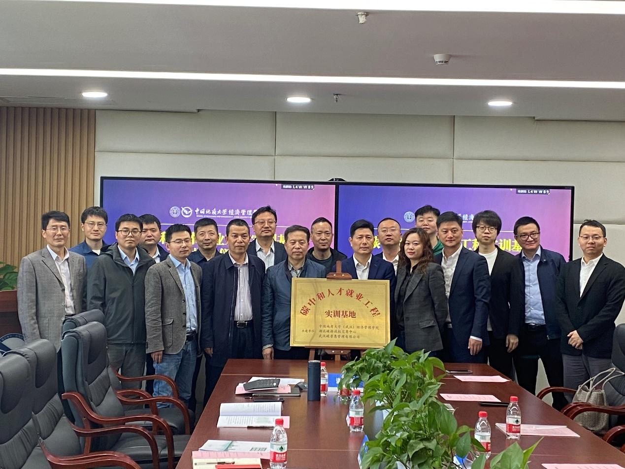 4月27日上午,为进一步助力国家实现“碳中和”目标,培养富有创新意识及实践能力的碳中和人才,“碳中和人才就业工程实训基地”揭牌仪式在公司顺利举行。湖北碳排放权交易中心有限公司党委副书记、总经理何昌福,湖北中碳资产管理有限公司党委委员、执行董事杨光星,碳能力建设培训部副经理王威,武汉碳普惠管理有限公司总经理刘树,华碳咨询(武汉)有限公司总经理杨之骄,副总经理张雁、白桦、邱振华,经济管理公司党委书记杨昌锐,经理杨树旺,副经理肖建忠、於世为、郭锐,工商管理系主任谢雄标及教师代表参加仪式。