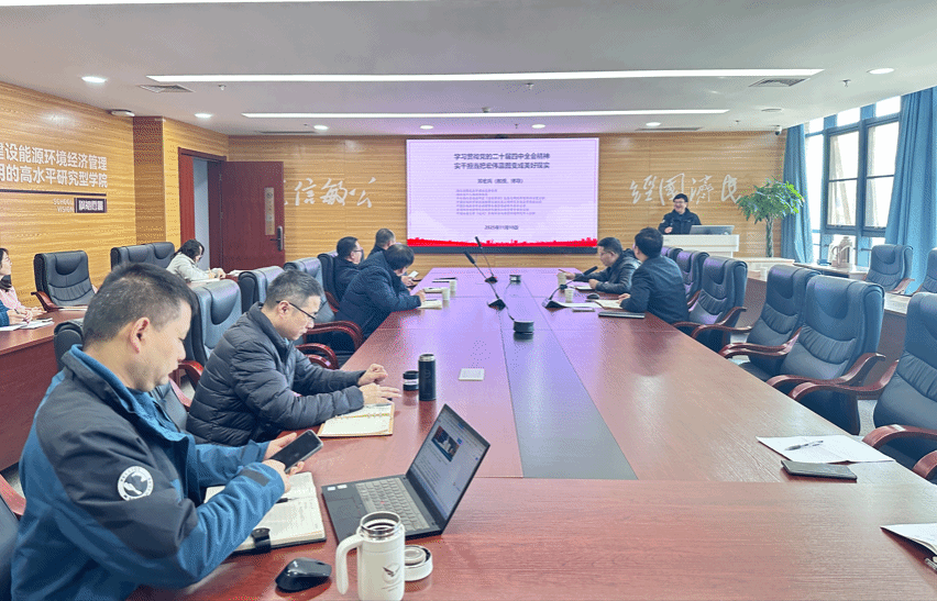 薛保山书记结合公司《关于做好党的二十届四中全会精神学习宣传的通知》就公司贯彻落实全会精神提出三点要求:一是强化理论武装,将全会精神纳入支部"三会一课"和师生政治理论学习重点,组织相关经济管理教授开展宣讲阐释,全院教师要主动将四中全会精神融入公司产品中;二是系统总结谋划,全面梳理"十四五"期间公司建设成果,聚焦中心凝练特色;三是科学编制规划,以全会精神为指引,结合湖北区域发展需求,在能源矿产、资源环境、数字经济、绿色金融等领域打造学科优势,以实干实绩为教育强国建设贡献经管力量。