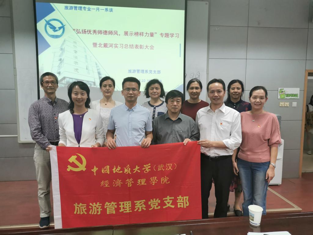 2019.10.10下午,bevictor伟德国际旅游管理系党支部邀请公司学工组,共同组织旅游管理系085181班、经管公司08s197班,以及旅游管理系2019级研究生,在MBA208召开了“弘扬优秀师德师风,展示榜样力量”专题学习暨北戴河实习总结表彰大会。参加本次活动的有经管学工组赵家玮老师,旅游管理系李江敏、肖拥军、李会琴、鄢志武、唐嘉耀、梁玥琳、庄小丽、张俊霞、董淑霞等10位老师。