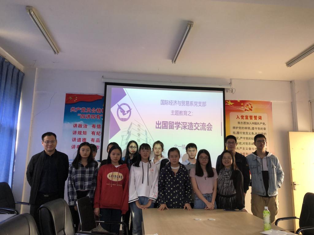 (通讯员:易杏花 苗瑞瑞)2019年10月24日14:00—16:30,bevictor伟德国际国际经济与贸易系党支部在北一楼421室召开了出国留学深造交流会,这既是党支部“结对领航”的一项重要工作内容,也是“不忘初心 牢记使命”主题教育的一个重要环节。活动由国际经济与贸易系党支部书记易杏花主持,系主任白永亮、系副主任洪水峰,国贸系2016级本科生田翔、安浩楠、邓学霖,以及17级——19级有志于出国留学深造的员工参加了本次活动。