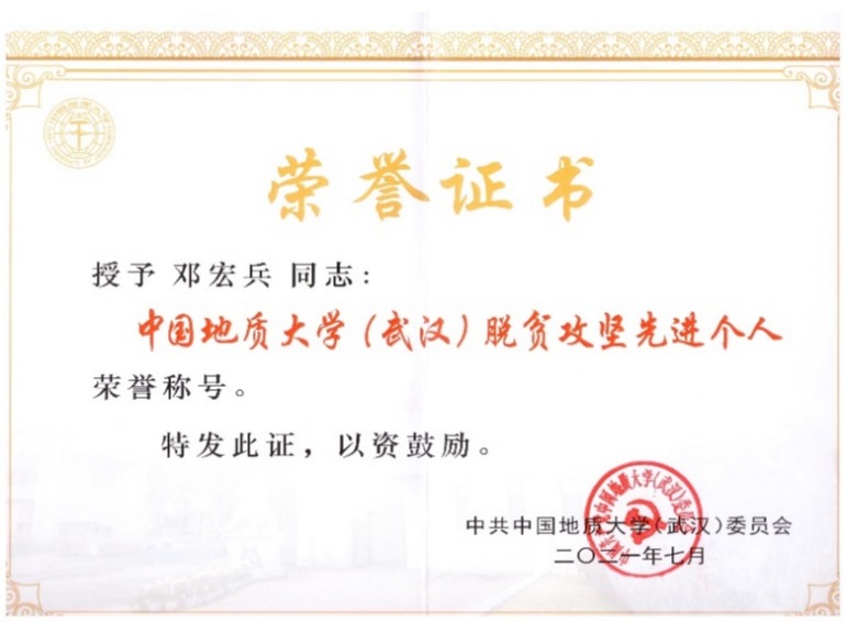 图3邓宏兵教授被授予“伟德国际唯一官网(武汉)脱贫攻坚先进个人”荣誉证书