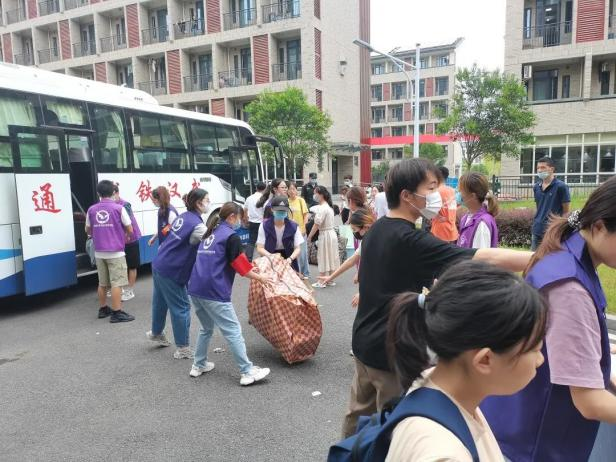 搬迁当天,公司党政领导、师生党员按照既定方案分别前往南望山校区和未来城校区,在各自的岗位上做好现场组织协调、帮助搬运行李等工作。同时,公司党委设置党员先锋服务岗,将员工劳动教育与志愿服务相结合,组织暑期留校的100余名员工党员和入党积极分子组成“党员搬迁服务队”,服务队队员佩戴党徽和袖标,分工合作,冒雨值守在接车点,奋斗在雨中抢搬行李。最终,在公司领导、师生党员志愿者的组织与帮助下,2020级全体本科生克服疫情影响、夏日酷暑、暴雨侵袭,用一天半的时间有序完成了搬迁工作,开始了新校区的学习篇章。