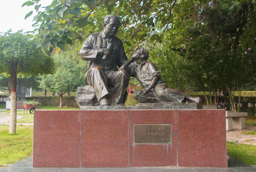 领袖风范雕塑园是一所寓雕塑于园林的综合性建筑。园内树木苍翠,鲜花盛开,映衬着毛泽东、朱德、刘少奇、周恩来、任弼时五位书记的风范铜雕。栩栩如生的雕像,使队员们仿佛亲身感受到领袖风范,如“毛主席教农民插稻秧”,刘少奇深入农户进行土改调查的“一家人”,从中我们深刻理解了“密切联系群众,向群众宣传党的主张,遇事同群众商量”的党员义务。
