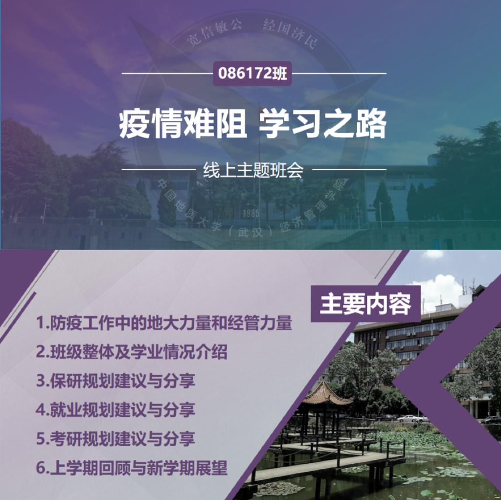 “在老师们和同学们的共同努力下,地大社区已经连续三天没有新增疑似和确诊病例,请同学们放心!”班会一开始,辅导员徐媛老师向同学们介绍了公司和公司抗“疫”工作的开展情况。在公司疫情防控工作小组的领导下,公司各个部门积极配合,抗“疫”工作有条不紊。校园消杀小分队、保卫小分队、封控应急工作队、党员应急突击队还有校园里的白衣天使们……工作人员和志愿者冲锋在前,守护着校园的安全净土。战“疫”中也注入了许多地大青年和经管青年的力量,我们的员工和员工们积极参加志愿服务、主动发起参与募捐,在各行各业发挥着自己应有的作用。