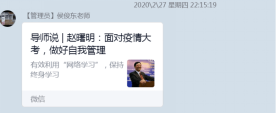 082181班班主任侯俊东老师以“用心筑牢战‘疫’防线,以学助力抗‘疫’胜利”为题,对线上教学中反映出的一系列问题予以悉心解答,并从“迎战转换”勤思考,调整心态抗焦虑,制定计划补短板,学会感恩惜当下等方面,给出同学们中肯的建议。他说:“市场营销专业的同学们要有批判性思维,从市场的角度思考问题,以营销管理的方法关注社会,学会合理使用在线资源,与任课老师保持充分沟通,提高解决问题的能力。同学们还要学会感恩,懂得感恩,感恩遇见,珍惜眼前人,我们是最棒的!”