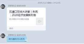 082171班谢雄标老师将2017级现阶段定位为深化专业知识的关键阶段,他深入浅出地分析当前我国经济建设的严峻形势,从市场环境、就业情况等方面解析疫情带来的影响,告诉同学们如何应对。他从时间管理、在线学习、高效规划等方面讲述提高专业素养的重要性,与同学们交流探讨协作学习模式的有利之处。