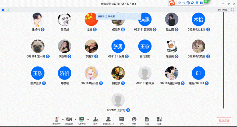 (员工记者:田敬宇)4月30日,“五·一”劳动节、“五·四”青年节双节来临之际,082181班在云端迎来22个小头像的再相聚。班主任侯俊东老师专题召开“停课不停学,居家不松懈”主题班会,动员大家积极准备期末考试,掌握学习方法,同时强调小长假疫情防控安全。班长徐扬祎主持班会。