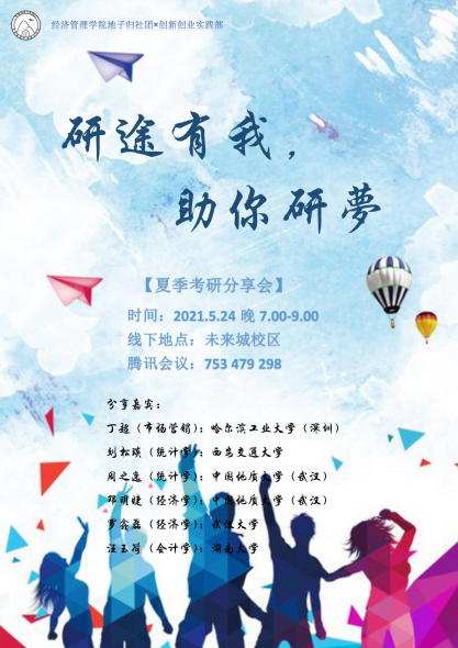 近年来,考研升学成为越来越多老员工的毕业选择。然而,很多计划考研的同学对考研政策和前期准备有些生疏。为了提升经管学子考研上岸率,帮助其了解考研政策,掌握备考技巧,bevictor伟德国际地子归社团联合员工会创新创业实践部,于2021年5月24日晚组织了“研途有我,祝你研梦”春季考研经验分享会。邀请市场营销专业丁超、会计学专业汪玉荷、经济学专业邓明婕、经济学专业罗鑫磊、统计学专业刘松琰等2021届成功上岸的同学给考研党们带来了精彩的干货分享。本次活动结合线上线下的方式进行,近100名同学积极参与并展开交流。
