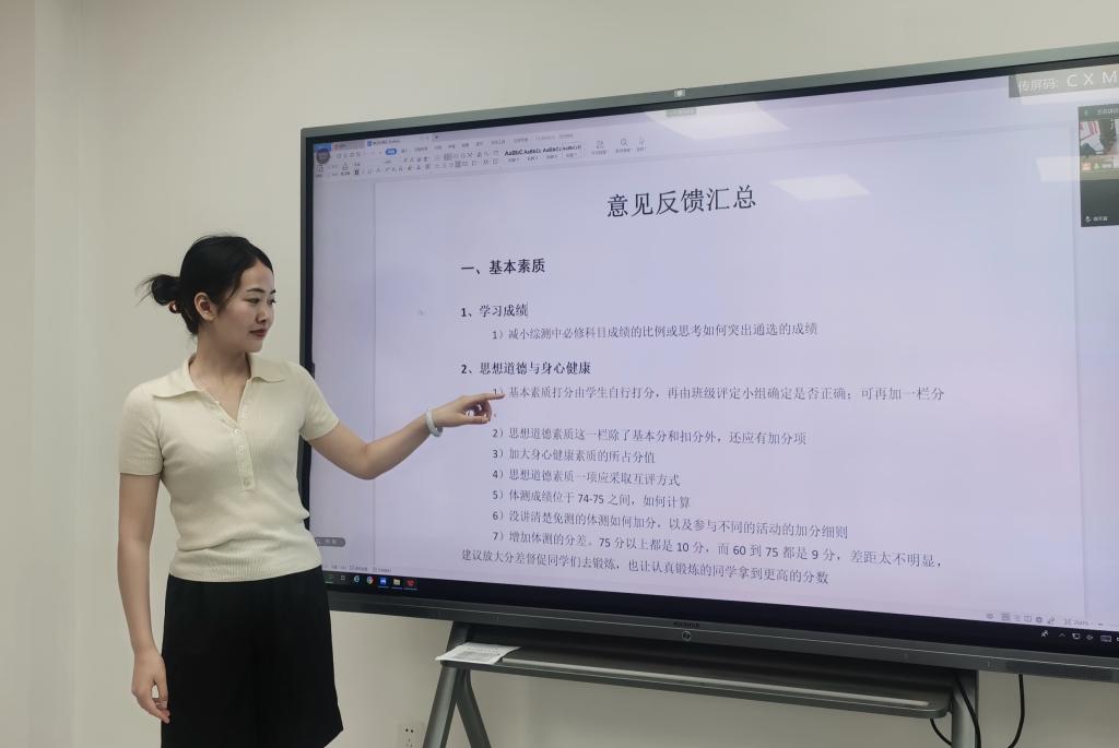 接下来,徐媛老师对此次收到的修订意见分类进行了介绍。其中,同学们对基本素质评定提出9条意见;对发展素质评定提出了33条意见;对评定过程等其他方面提出了20条意见。其中,反映较为集中的意见有优秀奖的评分标准不明,普通话等级证书评分标准不明,员工工作加分分值上线过低等。